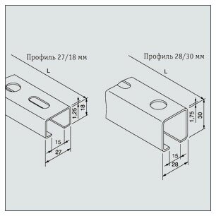 - Вследствие разных геометрий отверстий типа 27/18 мм и 28/30 мм шины можно прикреплять к стенам, полам и потолкам разными способами.