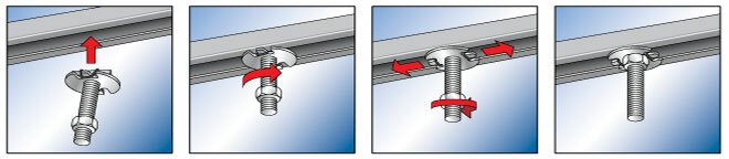 - Систему подвески можно произвольным образом выравнивать и перемещать в монтажной шине, при этом она не выпадает. Это облегчает процесс работы и одновременно экономит время. После выравнивания необходимо закрепить систему подвески с помощью гайки.